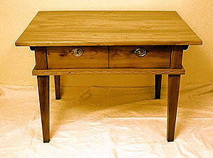 bäuerlicher Tisch Biedermeier (Klassizistischer Einschlag) Pfalz, 1800/10, massiv Kirsch Intarsien, 2 Laden